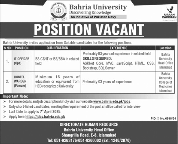 Candidates if you are seeking Bahria University Jobs 2025 In Islamabad Online Apply Yes. then it would help if you tried to complete this Bahria University Jobs because here you can easily apply for these vacancies: IT Officer (Ops), and Hostel Warden (Female).