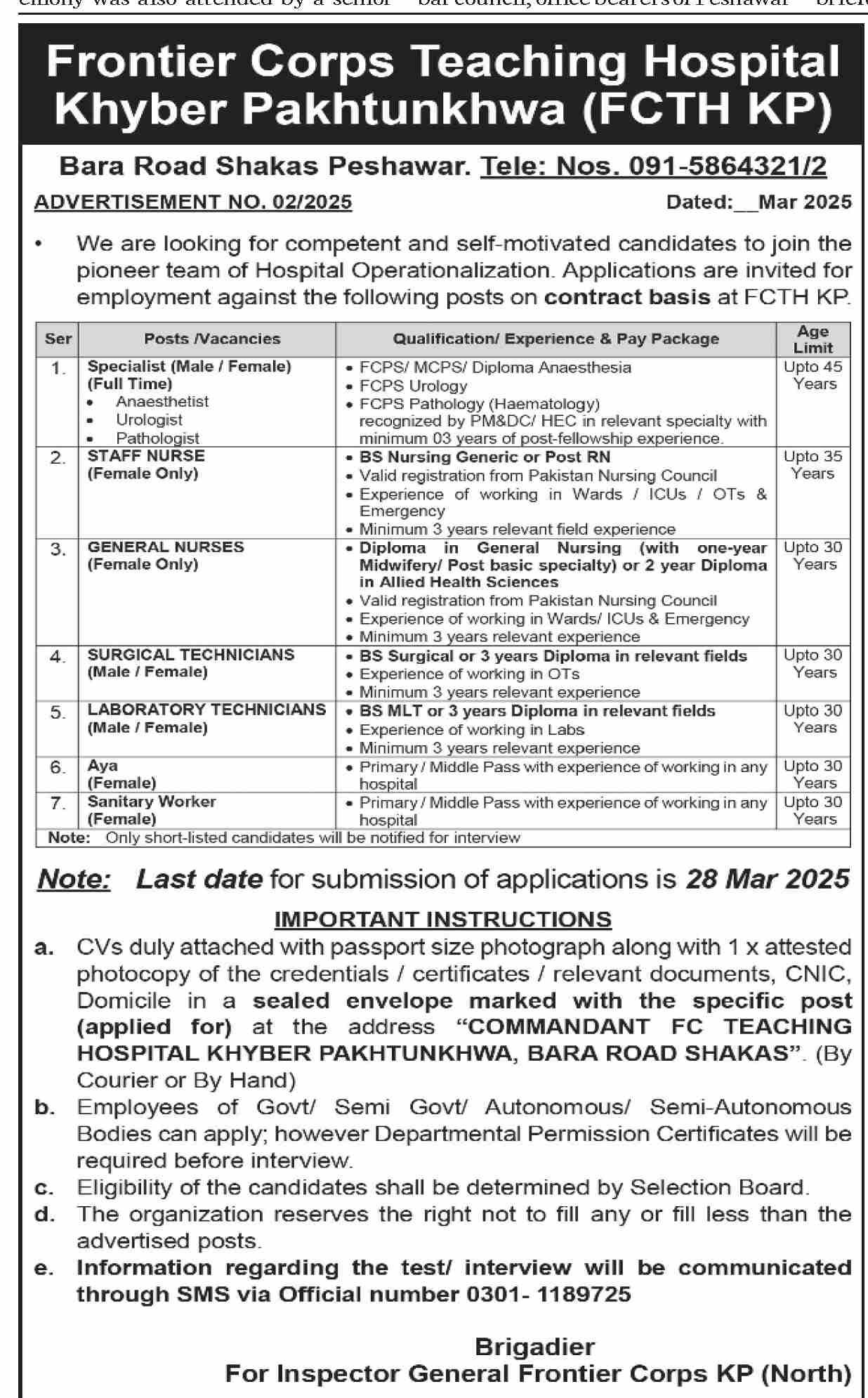 The last date to apply for this job is 28th March 2025.Frontier Corps Teaching Hospital KPK Jobs 2025 Advertisement