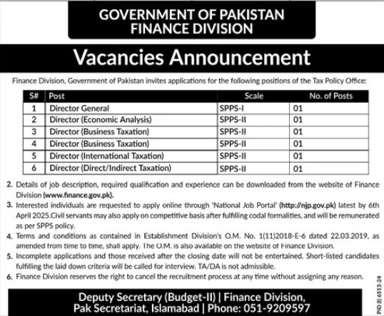 Candidates, if you are seeking Government of Pakistan Finance Division Jobs 2025, Apply Online yes. Then it would help if you tried to complete the Government of Pakistan Finance Division Jobs because here you can easily apply for these vacancies: Director General (Economic Analysis), Director (Business Taxation) Director (Business Taxation Director (International Taxation), Director (Direct/Indirect Taxation).