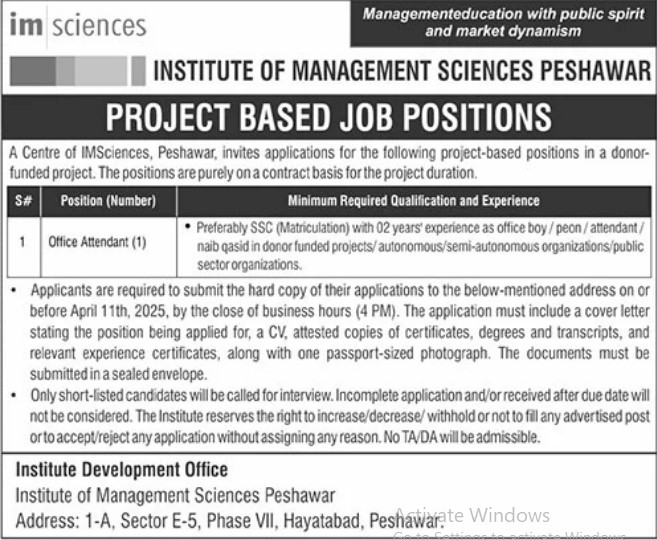 Candidates, if you are seeking Institute of Management Sciences Peshawar Jobs 2025, yes. Then it would help if you tried to complete this Institute of Management Sciences Peshawar Jobs because here you can easily apply for this vacancy: Office Attendant.