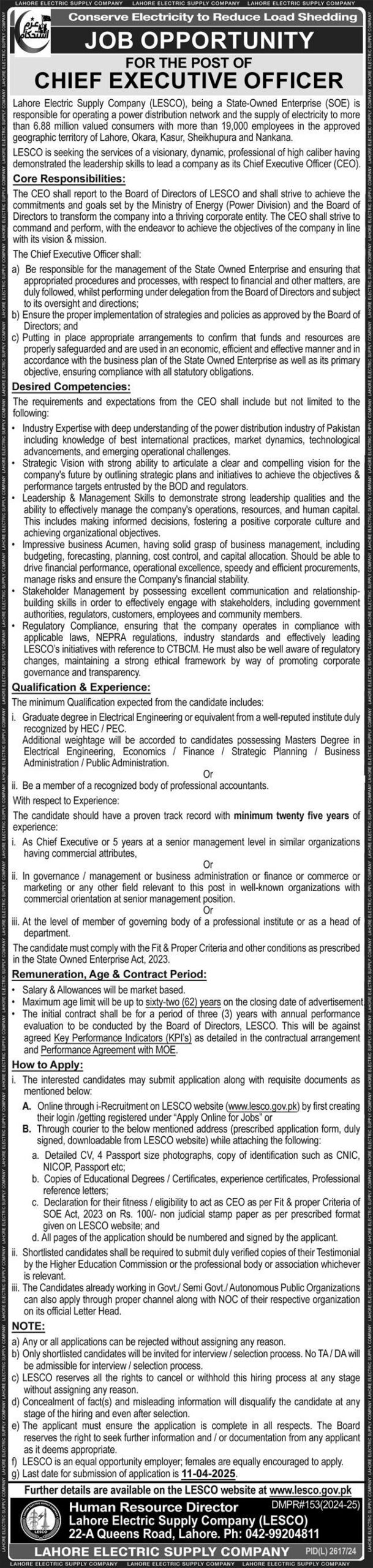 Candidates if you are seeking Lahore Electric Supply Company Jobs 2025 Apply Online yes. then it would help if you tried to complete this Lahore Electric Supply Company Job because here you can easily apply for this vacancy: Chief Executive Officer.