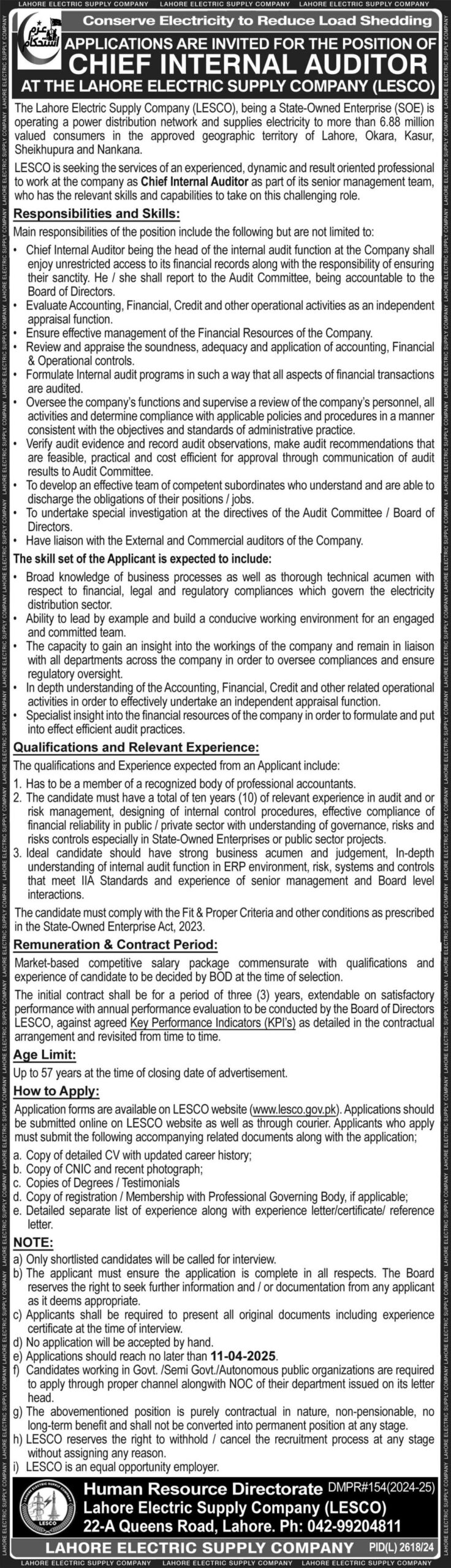 Candidates if you are seeking LESCO Jobs 2025 Online Application yes. then it would help if you tried to complete this LESCO Job because here you can easily apply for this vacancy: Chief Internal Auditor.