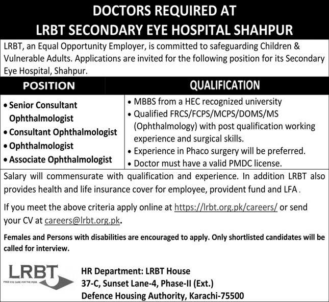 Candidates, if you are seeking LRBT Jobs 2025 | Hospital Jobs 2025 In Karachi, yes. Then it would help if you tried to complete these Hospital Jobs because here you can easily apply for these vacancies: Senior Consultant Ophthalmologist, Consultant Ophthalmologist, Ophthalmologist Associate, Ophthalmologist.