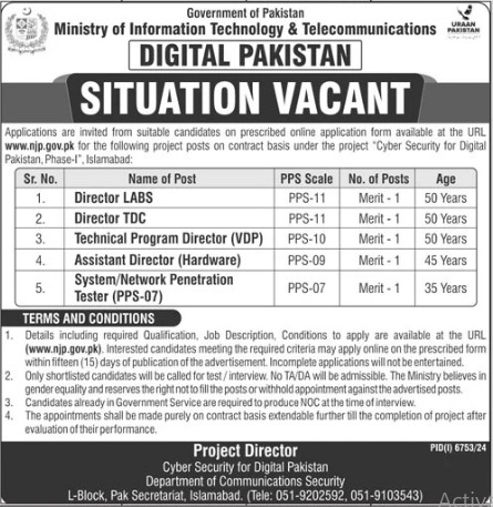 Candidates, if you are seeking Ministry of Information Technology & Telecommunications Jobs 2025, yes. Then it would help if you tried to complete the Ministry of Information Technology Jobs because here you can easily apply for these vacancies: Director LABS, Director TDC, Technical Program Director (VDP), Assistant Director (Hardware) System/Network Penetration Tester (PPS-07).