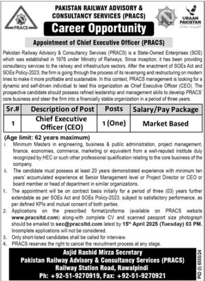 Candidates, if you are seeking Pakistan Railways Advisory & Consultancy Services Jobs 2025, yes. Then it would help if you tried to complete this Pakistan Railways Advisory & Consultancy Services Jobs because here you can easily apply for these vacancies: Chief Executive Officer.