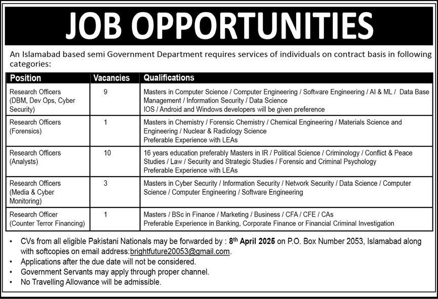 Candidates, if you are seeking Semi Government Department Jobs 2025 in Islamabad, yes. then it would help if you tried to complete this Semi Government Department Jobs because here you can easily apply for these vacancies: Research Officers (DBM, Dev Ops, Cyber Security) Research Officers (Forensics) Research Officers (Analysts) Research Officers (Media & Cyber Monitoring) Research Officer (Counter Terror Financing).