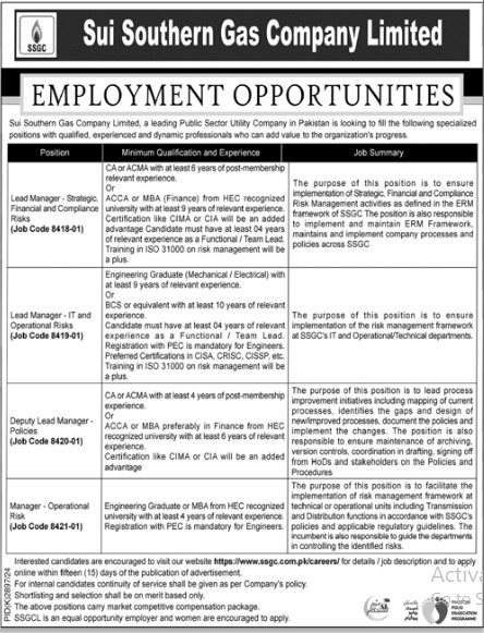 Candidates, if you are seeking Sui Southern Gas Company Limited Jobs 2025, Apply Online. Then it would help if you tried to complete this Sui Southern Gas Company Limited Jobs because here you can easily apply for these vacancies: Lead Manager-Strategic Financial and Compliance Risks (Job Code 8418-01) Lead Manager-IT and Operational Risks (Job Code 8419-01), Deputy Lead Manager- Policies (Job Code 8420-01), Manager-Operational Risk (Job Code 8421-01).