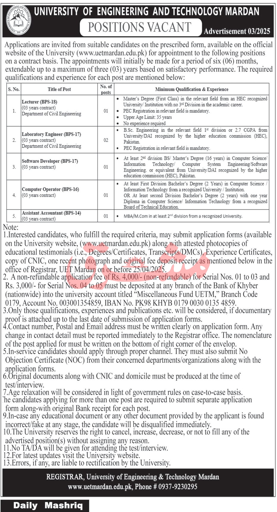 Candidates, if you are seeking University of Engineering and Technology Mardan Jobs 202,5, yes. Then it would help if you tried to complete the University of Engineering and Technology Jobs because here you can easily apply for these vacancies: Lecturer (BPS-18), Laboratory Engineer (BPS-17), Software Developer (BPS-1,7), Computer Operator (BPS-16), Assistant Accountant (BPS-14).